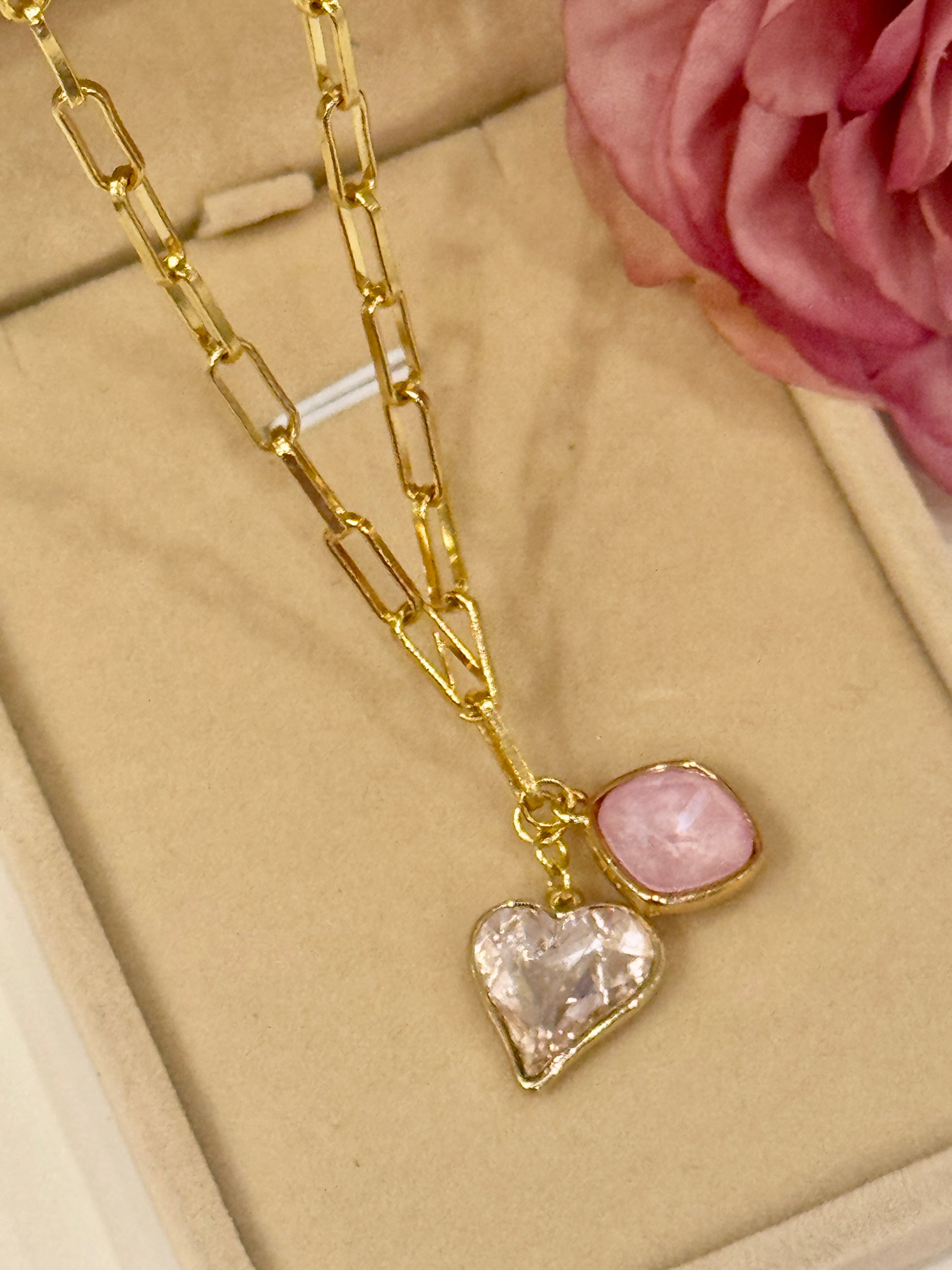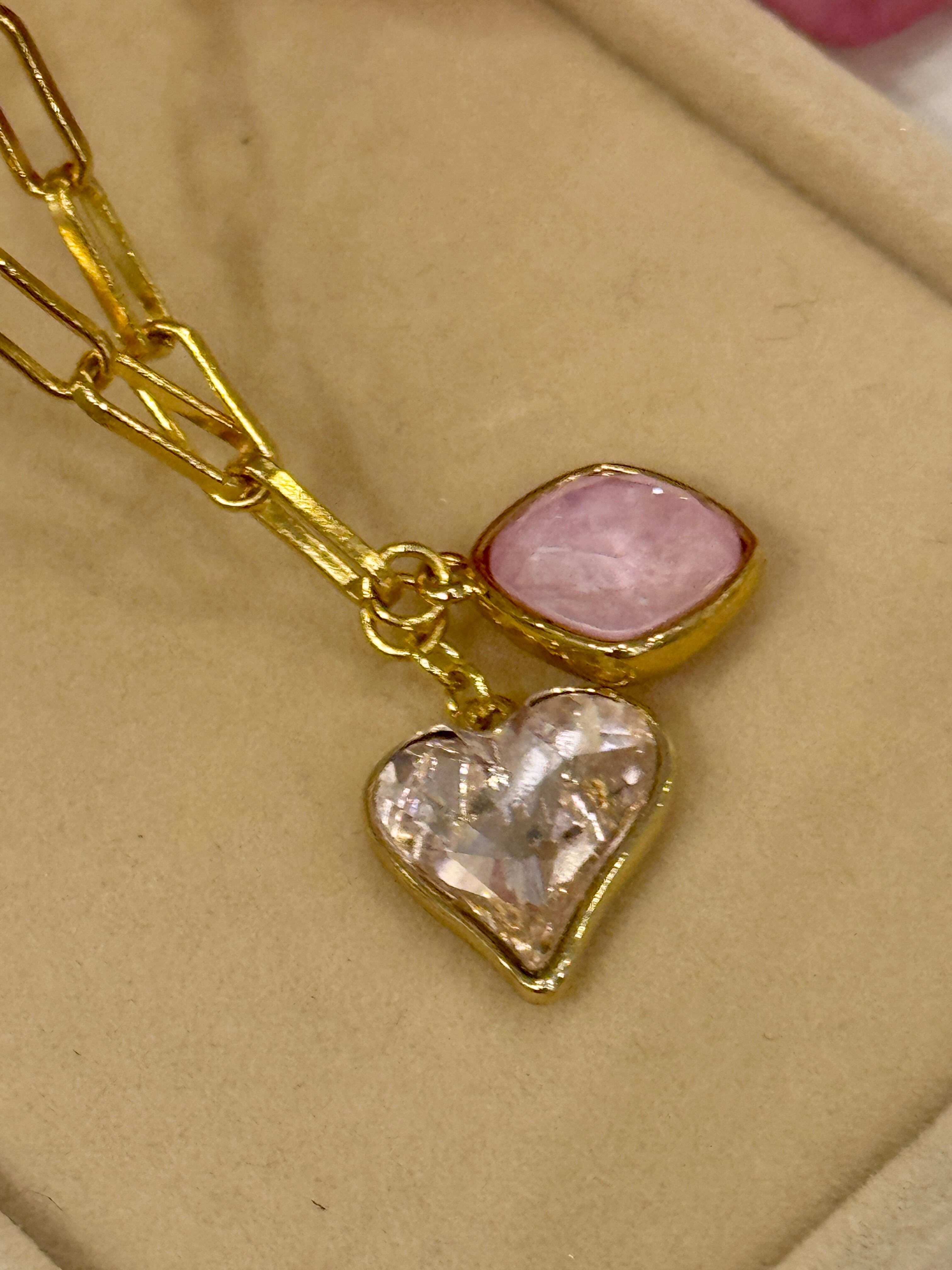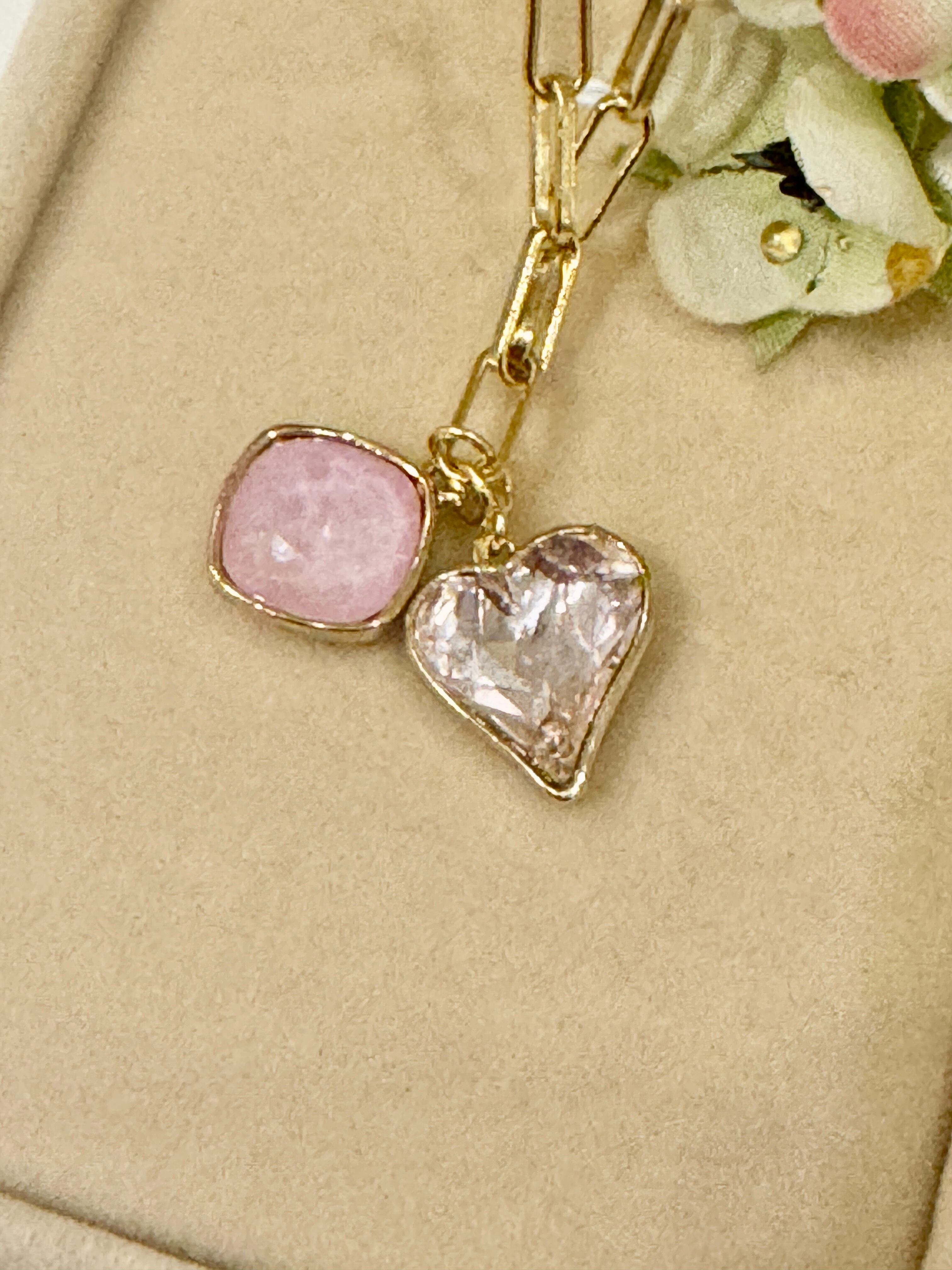 クリスタルのハートのロザリンとスクエアーラベンダーディライトを使用した、愛のネックレス。